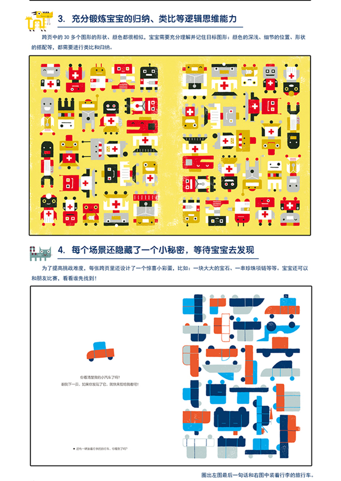 3.充分锻炼宝宝的归纳、类比等逻辑思维能力。跨页中的30几个图形的形状、颜色都很相似,宝宝需要充分理解并记住目标图形:颜色的深浅、细节的位置、形状的搭配等,都需要宝宝进行类比和归纳。