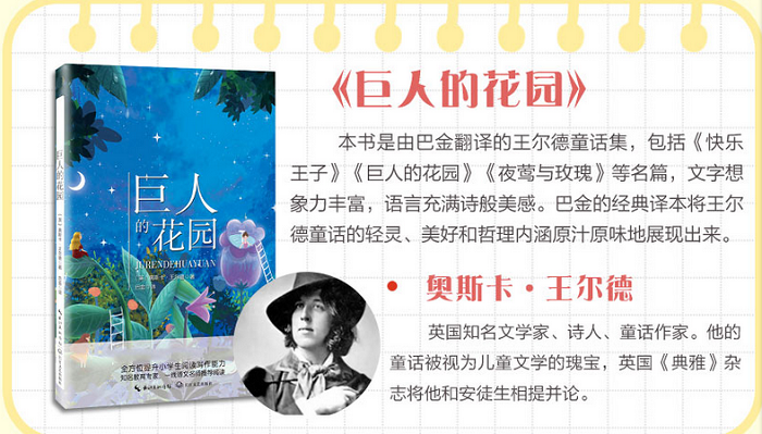 《巨人的花园》是由巴金翻译的王尔德童话集,包括名篇《快乐王子》《巨人的花园》《夜莺与玫瑰》等,内容全面,翻译非常不错。其中《巨人的花园》入选统编小学语文教科书。王尔德的童话向人们展示了一个天真坦荡的心灵世界,故事里往往赞美勇敢的心、无私的友谊,和对世人的大爱。他的文字想象力丰富,语言充满诗般美感,笔下的人物、动物形象都生动有趣。巴金的翻译也贴合了原版的气质,将王尔德童话的轻灵、美好和哲理内涵原汁原味地展现出来。