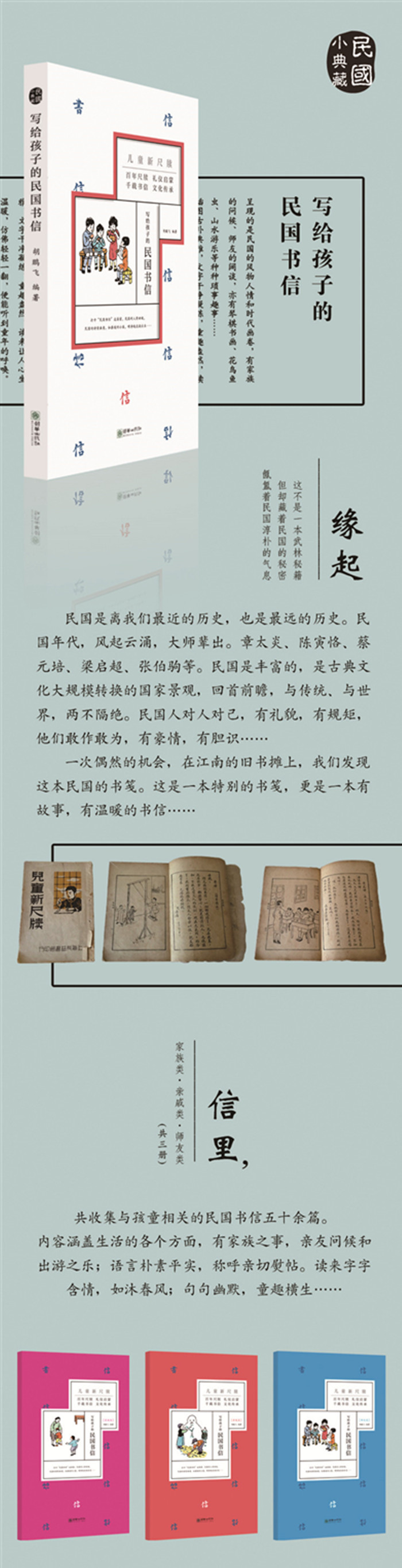 写给孩子的民国书信》一辑三册,分家族、亲戚和师友三类。共收集与孩童相关的民国书信五十余篇。内容涵盖生活的各个方面,有家族之事,亲友问候和出游之乐;语言朴素平实,称呼亲切熨帖。读来字字含情,如沐春风;句句幽默,童趣横生……