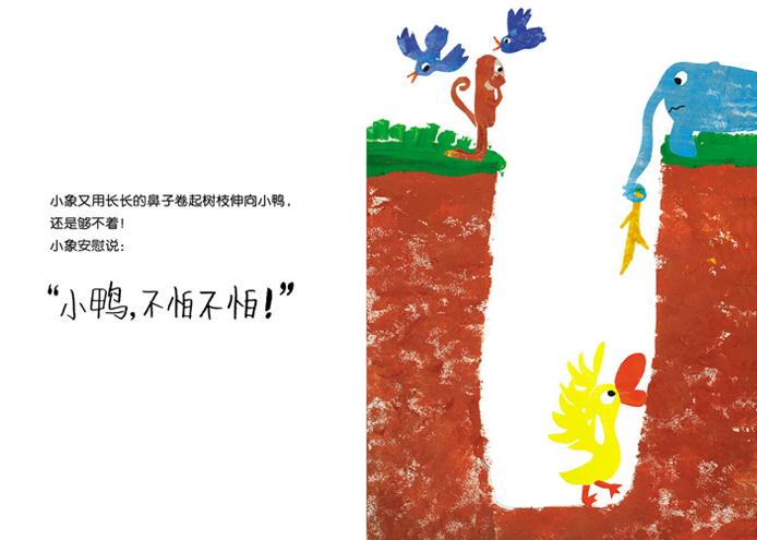 这是一本妙趣横生的图画书。小鸭喜欢的事情是和好朋友们一起玩,玩捉迷藏时她不小心掉入一个大深坑,好朋友纷纷前来,想各种办法,并安慰他说:小鸭不怕。 小鸭怎么被救助上岸的呢?作品用拼贴画+彩绘的方式,来告诉你一位九岁孩子的温暖有趣的视角。全书流露出的温暖和善良,天真和智慧,如金子般熠熠发光。之前市场上出版的图画书大部分都是成年作家绘画创作的,而孩子们同龄人的作品 少。黄钰婷作为一个9岁的小朋友能创作出一本既有可读性,画面又比较精美的作品是难能可贵的,该作品能给对图画书拥有同样热情的小朋友以激励和榜样的作用。