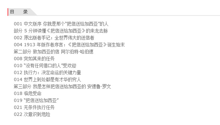 1898年,美西战争爆发前,美国总统麦金利急需古巴战争情报,于是请罗文中尉把信送给古巴起义军将军加西亚。加西亚将军隐藏在古巴山区,谁也不知道他的确切位置。罗文中尉果断出发,冒着生命危险,历经千难万阻,以坚定的信念及超强的执行力,最终完成任务,为美国带回关键的情报。 1899年,阿尔伯特·哈伯德先生为一本叫《菲利士人》的小杂志撰写了一篇社论《把信送给加西亚》,灵感就是源于美西战争中,罗文中尉把信送给加西亚将军的故事。这篇文章一经发表,备受关注,印制成小册子出版,时至今日,畅销不衰。 罗文精神永远值得人们铭记与学习,因为社会急需罗文这样的人。本书还独家编译了把信送给加西亚的十个法则,告诉你罗文成功的独家秘诀。 翻开此书,只需安静阅读两个小时,你就是那个把信送给加西亚的人!
