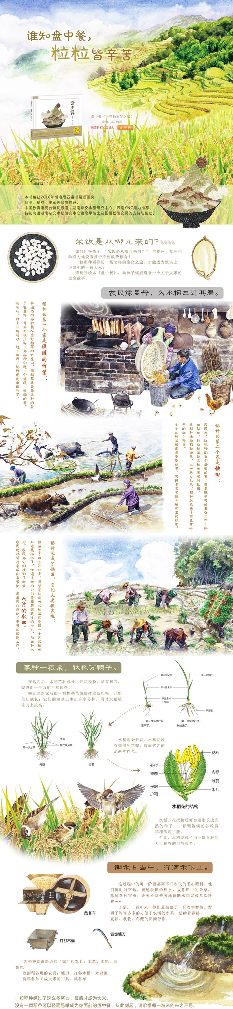 水稻是全世界人口为主食*多的农作物,更是中国和亚洲国家多数国家*主要的粮食作物。水稻属作物在各国的各地有着不同的生长情况,作者选取位于中国西南部的云南省元阳梯田(已被列入世界文化遗产名录)作为背景,呈现中国*传统的水稻种植和加工方式以及少数民族的特殊农耕文化,在以机械化逐渐取代人工劳动的现代社会,人们有必要了解我们的过往,为我们的未来发展指引方向。同时希望让更多在城市里的孩子了解自己面前食物的得来不易,能更加珍惜农民的辛勤劳动。