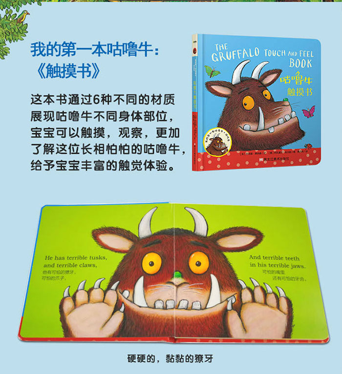《我的*本咕噜牛:咕噜牛触摸书》 咕噜牛长什么样子呢?这本书通过6种不同的材质展现咕噜牛不同身体部位,宝宝可以触摸,观察,更加了解这位长相怕怕的咕噜牛。不同材质可以让宝宝充分感知,理解什么硬,什么软,什么光滑,什么有毛刺。给予宝宝丰富的触觉体验。