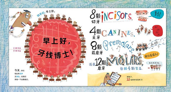 这本关于牙齿的科普图画书,不带任何说教,用拟人的方式把嘴巴当成牙齿学校、把每颗牙当成一个个性格鲜明的课堂小精灵,用夸张幽默的方式,描写了牙齿学校发生的各种趣事。并且不着痕迹地把爱牙、护牙以及和牙齿相关的各种知识贯穿其中。这样的故事方式,容易让孩子产生代入感、引起共鸣, 因此也会更好地明白爱牙、护牙的方法与重要性,从而培养爱护牙齿的好习惯。