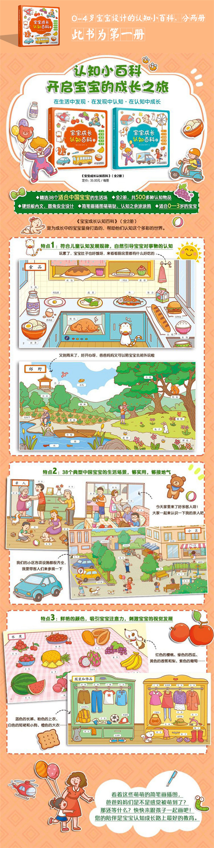 《宝宝成长认知百科1》这是一套专为0-4岁宝宝设计的认知小百科,分两册,以卡通画的形式生动形象地表现了0-4岁宝宝需要认知的日常物品、一般概念及各类生活场景,帮助宝宝认识周围的世界。本册内容涉及食物、餐厨具、家用电器、日常衣物、动植物、颜色、简单数字等。