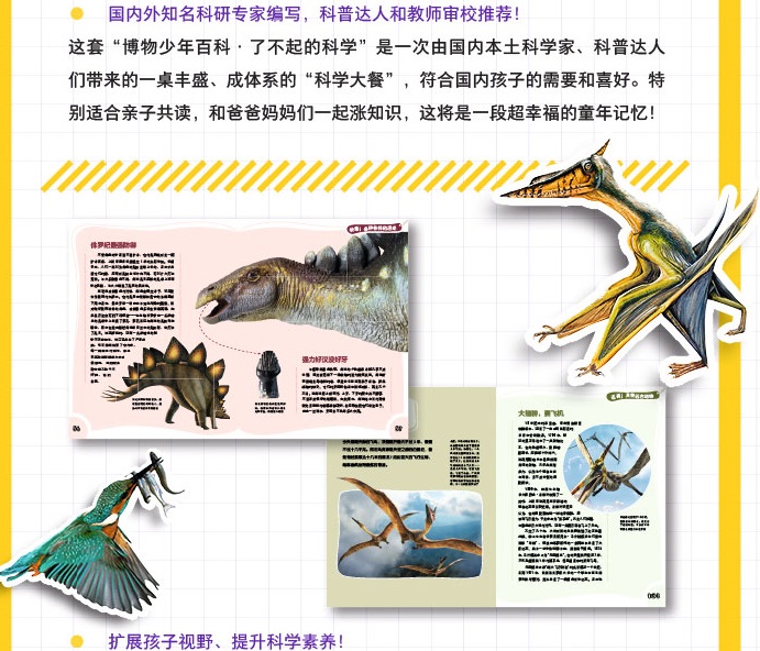 博物少年百科系列共6本,主题分别为:恐龙、鸟类、人体知识、身边的科学、零食奥秘和神奇建筑,分别由古生物学家、鸟类研究者、医学专家、博物学达人、营养师和北京四中教师改编推荐,以独特视角,用精美的图片、轻松严谨的文字,成体系的科学知识,为孩子带来一次全新的科学之旅。