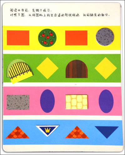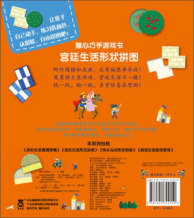 《慧心巧手游戏书:宫廷生活形状拼图》的拼图既有拼的乐趣,还有寻找的过程。拼能锻炼手指灵活度,寻找是记忆力、观察力的挑战,这是一次手脑并用的智力大挑战。 同时将形状、颜色认知穿插其中,在游戏中轻松学知识。
