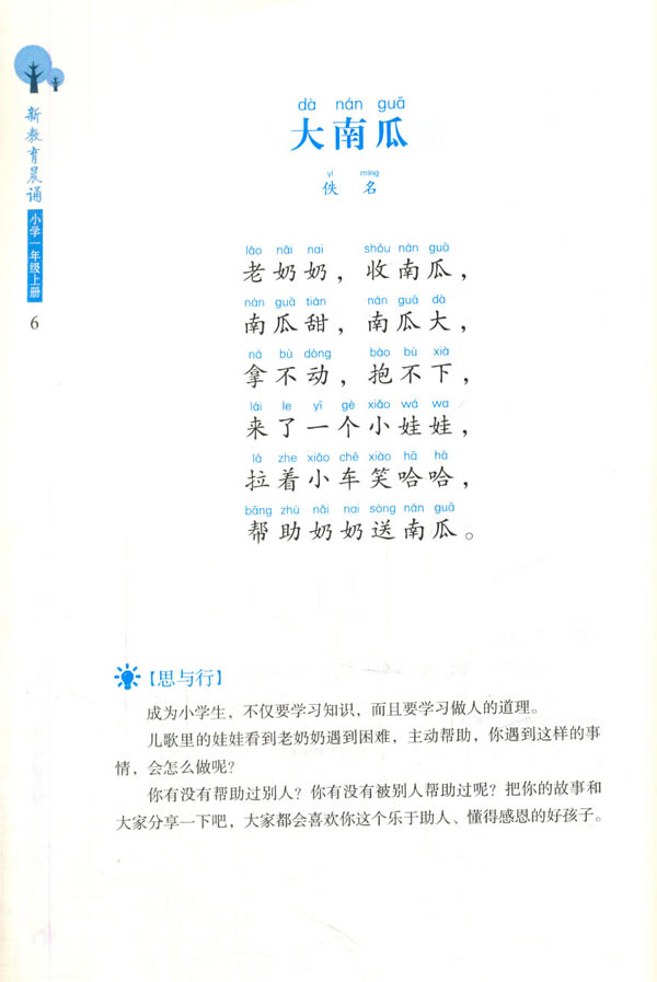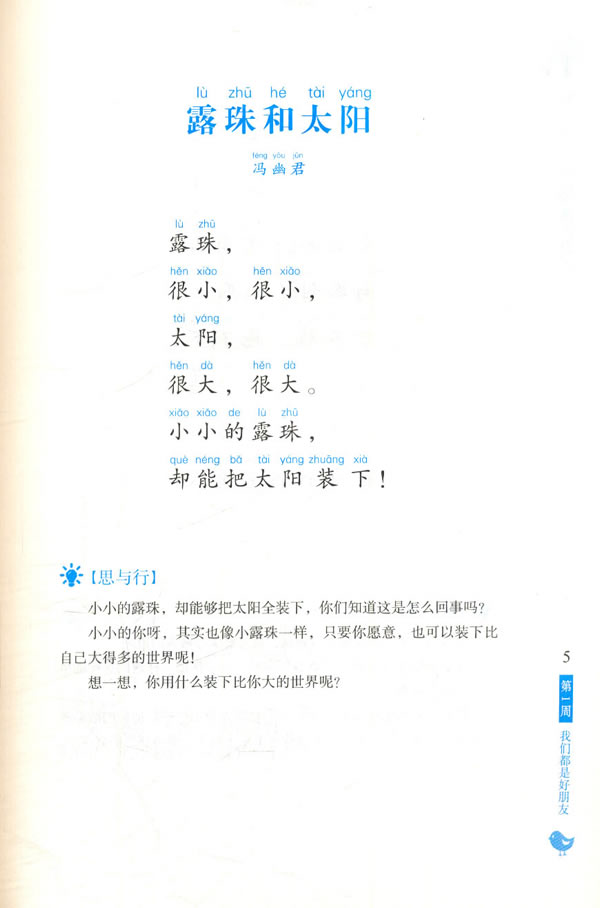 本套书由著名教育家朱永新,教育哲学博士、著名特级教师许新海,著名儿童文学作家童喜喜联袂主编,由新教育研究院组织全国近百位一线名师精心编写,为新教育唯一一套官方晨诵读本。 丛书坚持以儿童立场为出发点,强调与经典相遇,与生命共鸣,与儿童当下生活相结合,用美好诗歌引领儿童精神成长。本书为一年级上册,精心遴选一年级孩子喜闻乐见的、适合他们发展特点及接受水平的儿歌、古诗、绕口令、诗歌等,以主题的形式呈现,附加新教育一线名师精心撰写的“思与行”及主题活动设计,让诗歌与生命发生共鸣,拓展孩子的生活世界和文化视野,激发孩子的想象力和创造力。同时,亦会给进行晨诵教育的老师和正指导孩子从亲子共读走向独立阅读的父母们更多的启发及指导。
