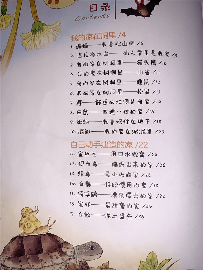 人类喜欢住在房屋里,房间的每一个角落都布置得整洁又温馨。动物们也有自己的家。蝙蝠住在黑漆漆的山洞里,泥鳅的家在凉爽的淤泥里,蜜蜂的家在甜蜜的蜂巢里……动物界有非常出色的建筑师。金丝燕用口水在峭壁上做窝,织布鸟用草绳在树枝上编织美丽的家,河狸为自己的房子修了换气的烟囱……现在,我们一起去动物的家里做客吧!