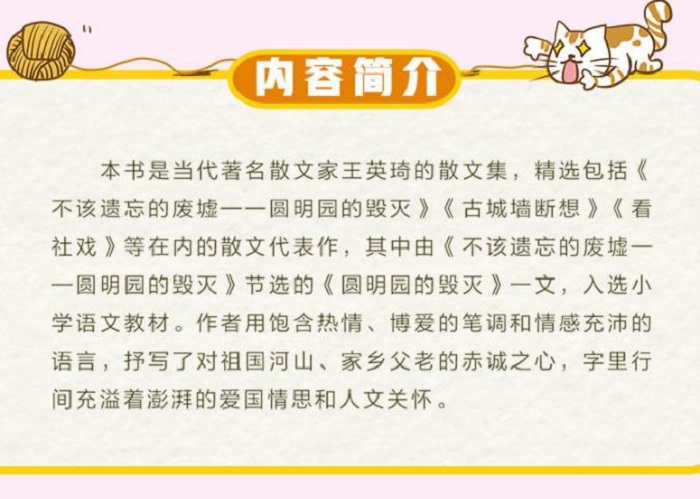本书是当代著名散文家王英琦的散文集,精选包括《不该遗忘的废墟——圆明园的毁灭》《古城墙断想》《看社戏》等在内的散文代表作,其中由《不该遗忘的废墟——圆明园的毁灭》节选的《圆明园的毁灭》一文,入选小学语文教材。作者用饱含热情、博爱的笔调和情感充沛的语言,抒写了对祖国河山、家乡父老的赤诚之心,字里行间充溢着澎湃的爱国情思和人文关怀。