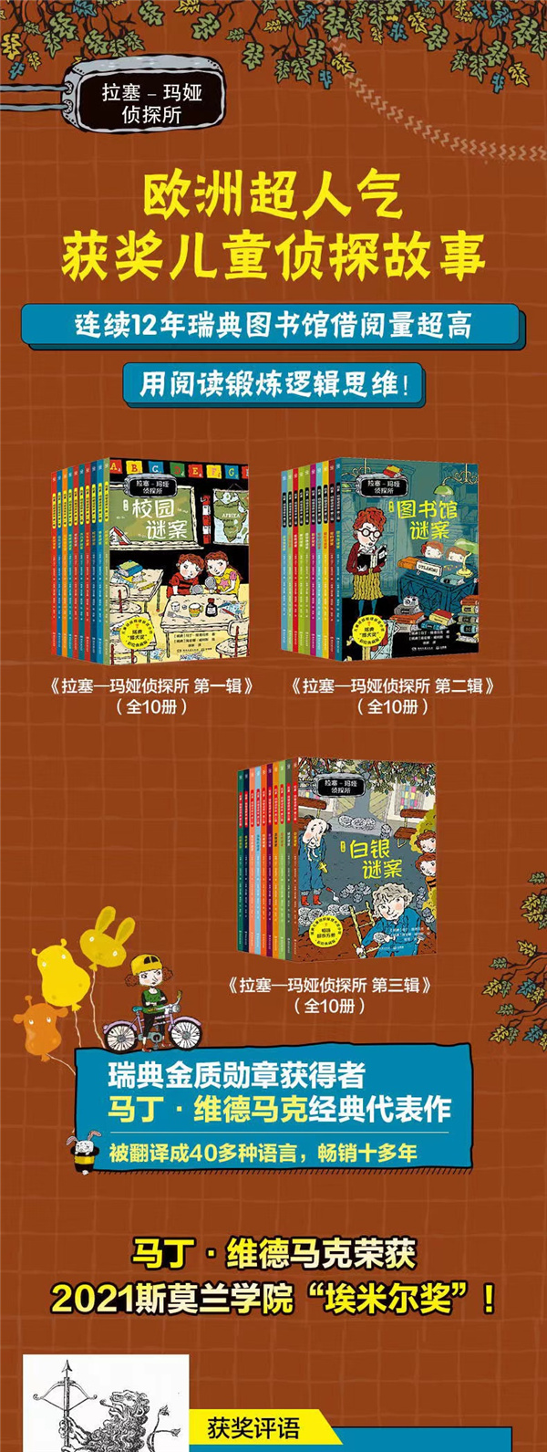 瑞典政府金质勋章获得者两度获得瑞典“猎犬奖” 曾 12 次获得“儿童读者评审团喜爱作家奖”作品连续 12 年蝉联瑞典图书馆借阅量榜首,打破了林格伦作品的借阅纪录 作品被翻译成 40多种语言,销量数百万册 瓦乐比城堡的主人要举办一场巧克力品尝会,要求来宾必须骑自行车前往。城堡的主人是一位伯爵,他自称非常富有,还拥有一座价值百万的种植园,但城堡里的大部分房间都空荡荡的,什么也没有。拉塞和玛娅怀疑……