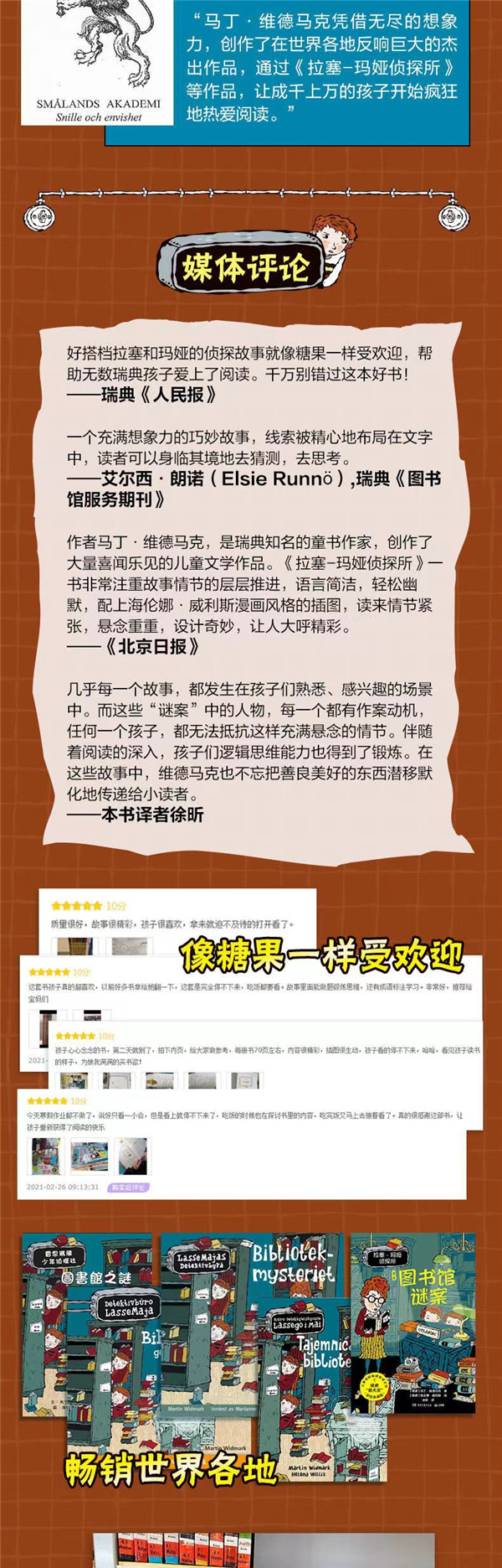 好搭档拉塞和玛娅的故事就像糖果一样受欢迎。只听到书页哗哗哗翻过的声音,一本书一下子就读完了。 --瑞典《人民报》 故事情节层层推进,语言简洁,轻松幽默,配上海伦娜·威利斯漫画风格的插图,读来情节紧张,悬念重重,设计奇妙,让人大呼精彩。 --网易读书