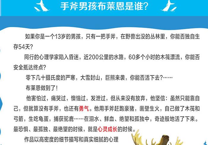 【最恐惧、最孤独、最绝望的时候,就是心灵成长的时候】 适读年龄:9岁及以上 ★ 荣获纽伯瑞儿童文学奖 ★ 入选纽约公共图书馆“100年来100部伟大的童书”(NYPL 100 Top Children’s Books of the Last 100 Years, 2012) ★ 入选美国《学校图书馆杂志》“100部优秀儿童小说”(SLJ’s Top 100 Children’s Novels, 2013) ★ 被译作15种语言出版,畅销全球1300万册 ★ 细节逼真,令《美国国家地理杂志》认为是真实事件 ★ 著名儿童文学作家彭懿作序导读 ★ 精美封面,双色内文,阅读好享受,经典永珍藏 系列介绍: 如果你是一个13 岁的男孩,只有一把手斧,在野兽出没的丛林里,你能否独自生存54天? 同行的心理学家陷入昏迷,近200公里的水路,60多个小时的木筏漂流,你...