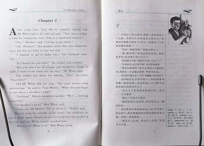 “书虫”系列是外研社和牛津大学出版社联合为中国英语学习者奉献的一大精品,丛书为世界优秀文学名著的英文简写本或原创作品,具体提高读者英文水平和陶冶情操的双重作用;故事情节生动,英汉对照,便于读者阅读理解。书后配适量练习题,检测读者的阅读效果和对语言点的把握。本丛书自问世以来深受广大学生、英语学习者的喜爱,连续多年畅销不衰。《猴爪》讲述了怀特一家因为一只神奇的猴爪陷入的种种离奇冒险,适合初一、初二学生阅读。