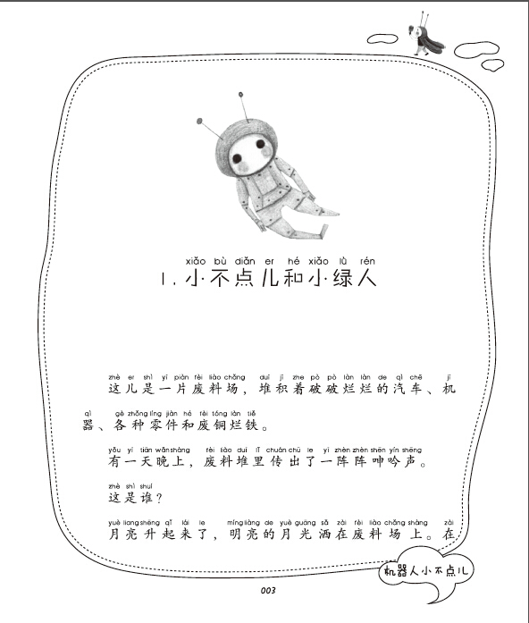这话被住在附近的一个聪明的小绿人听到了。她来到机器人跟前,仔仔细细地给他检查了一遍,发现他只不过是缺少了一颗螺丝钉。