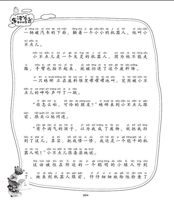 “有个淘气的孩子,以为我成了废物,就把我扔到了这儿。其实,把我修一修,我还是一个能干的机器人呢!”小不点儿很委屈地说。