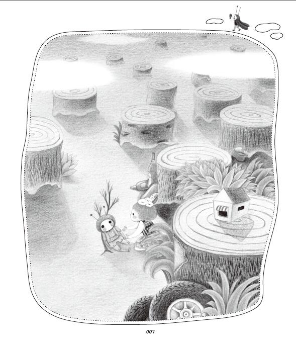 停了一会儿,小绿人说:“这片废料场原先是一片美丽的树林,树林里住着我们绿人一家。后来,这儿的树木被人砍伐了,就变成了这片废料场。”