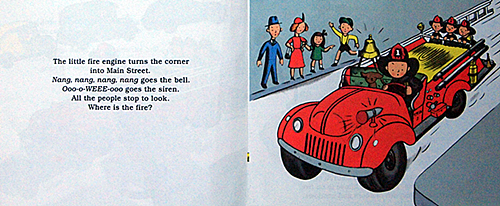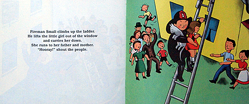 "Similarly, a pair of vintage Lois Lenski titles are adapted for board book format. The first, The Little Fire Engine (1946) stars Fireman Small as he heads off to a Tinytown blaze and rescues a girl and her cat on an upper floor. In The Little Train (1940), Engineer Small drives his locomotive past farmland, over a bridge and through a tunnel, before unloading passengers and U.S. mail at Union Station."