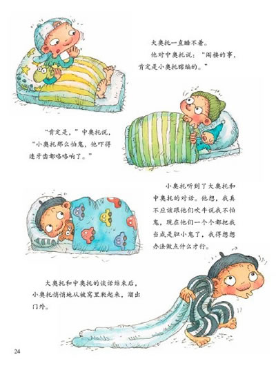 小奥托告诉希希说,他在自己家的阁楼上看见了鬼。希希不怕鬼,于是就和小奥托一起去他家的阁楼上抓鬼。小奥托指着阁楼上一扇小小的窗户,一个白色的东西飘出了窗外。希希告诉小奥托:“这个不是鬼,不过是窗帘飘出了窗外。”可是,小奥托竟然向中奥托和大奥托夸口说自己见到了鬼,而且根本不怕鬼。中奥托和大奥托决定去小奥托家过夜,等待鬼的出现。没想到希希听说后,也坚持要去小奥托家过夜。这个夜晚到底会发生什么事呢?半夜在小奥托的房间里乱窜的又是什么鬼呢?本册是“顽皮希希系列”的第八本。小孩子总是对所谓的鬼既好奇又害怕,希希和三个奥托也不例外。本册的故事情节丰富,十分有趣。在这个等待鬼出现的“闹鬼”之夜,希希和三个奥托互相考验,最终解决了内心里对“鬼”的疑惑和惧怕,“扮鬼”成为他们的一种开心游戏。