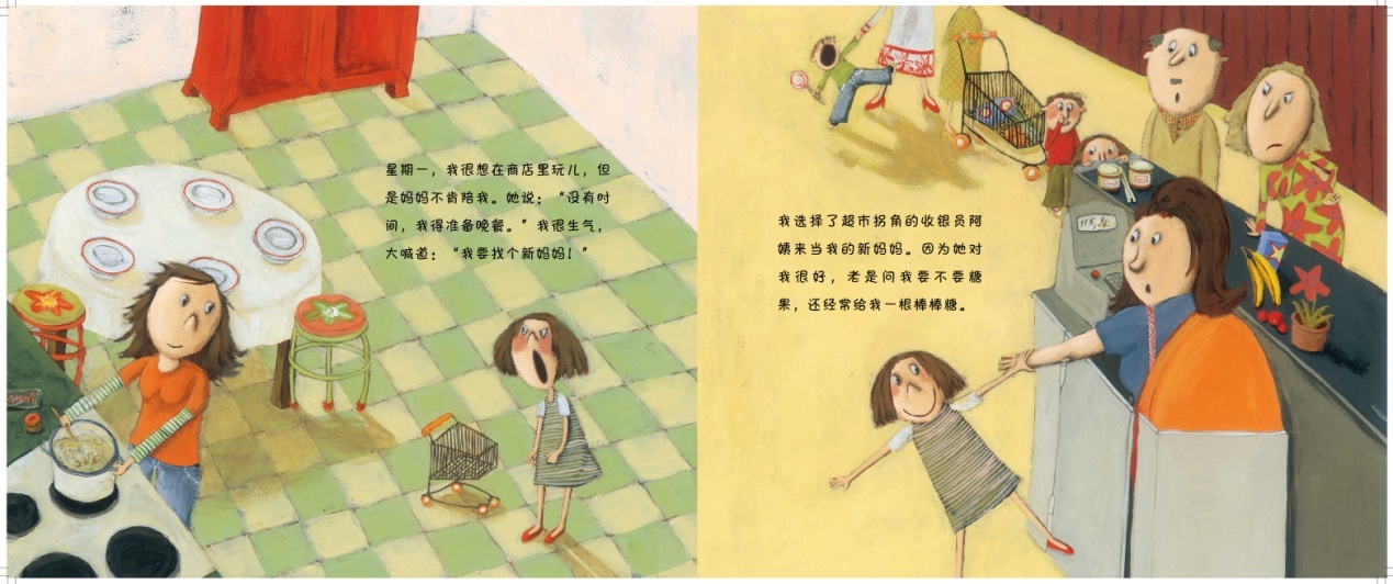 小女孩很喜欢在商店里玩,但是妈妈要准备晚餐。小女孩很生气,大叫道:“我要找个新妈妈!”爸爸和哥哥姐姐们也没有时间陪她玩儿,所以她决定要找个新家庭。新家庭什么都好,小女孩却越来越想念原来的家了。