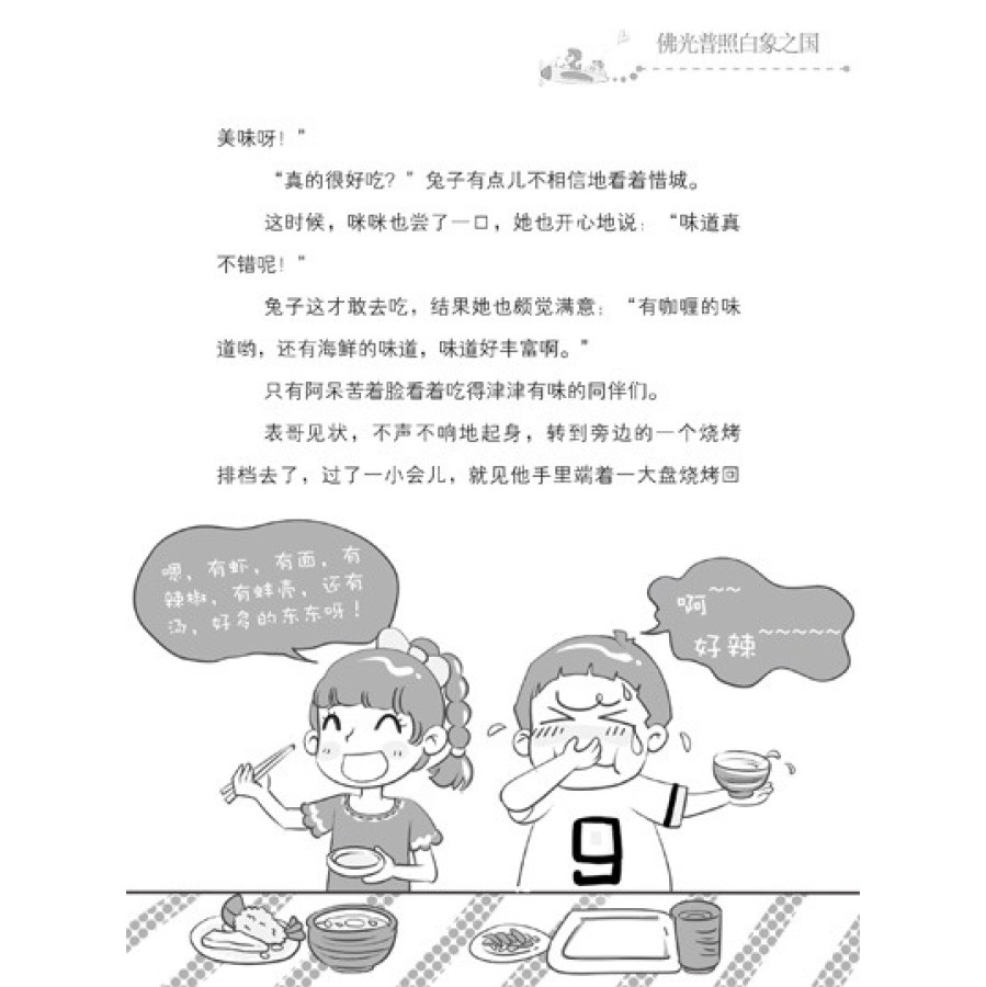 兔子、惜城、咪咪、阿呆,这四个《同桌冤家》里的活宝重新聚在一起,将在《同桌冤家走天下》系列中把这份欢乐延续下去。这是“阳光姐姐伍美珍”全新创作的系列,里面充满明亮的无厘头幽默、憨态可掬的人物、原汁原味的校园友谊,让你陷入青春色彩的爆笑旅程!“惜呆兔咪”可爱四人组,带你远行在地球的每个角落,体验“去远方”的无穷欢乐!本书为《同桌冤家走天下:佛光普照白象之国》。
