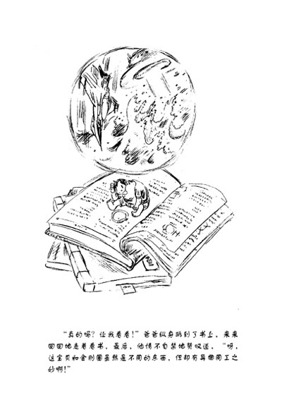 “真的吗?让我看看!”爸爸纵身跳到了书上,来来回回地走着看书,最后,他情不自禁地赞叹道:“呀,这宝贝和金刚圈虽然是不同的东西,但却有异曲同工之妙啊!”