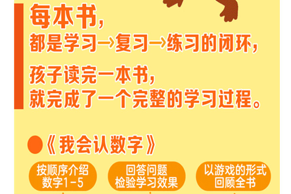 这套书是英国尤斯伯恩出版公司为0-3岁宝宝定制的启蒙认知书。这本书带着宝宝了解基数、序数,练习数10以内的数字,明白数量与数字对应,进行从小到大的排序,比较多少,学习简单的加减法,实现低龄段的数学启蒙。采用尤斯伯恩最为擅长的翻翻页工艺,让低龄宝宝快乐玩耍,轻松认知。跨页情景式插图,以及可爱的卡通形象,吸引孩子看不停,有效提升形象记忆力。