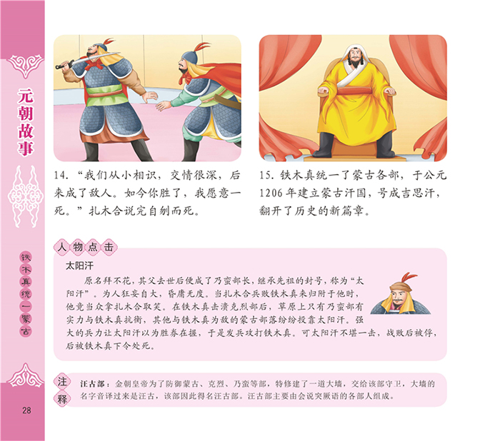本套丛书以儿童喜爱的彩色连环画形式来讲述中国经典历史故事。故事时间跨度较大,从春秋战国时期一直到清朝末期,选取的故事均较为经典,但同时照顾到读者的年龄,故事也同时有一定的教育意义,将古典的连环画与现代的卡通画法融为一体,可以让少年儿童了解中国的历史,激发他们学习历史的兴趣。书中每个故事的*后都会有“知识点击”栏目,即将该故事中涉及的重要人物和历史事件进行解读,扩展知识面,丰富图书的内容。