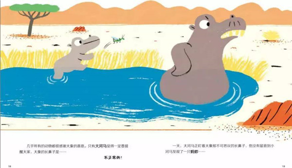 大河马认为,大象的长鼻子长得很奇怪,是不正常的,他便常常不分缘由地指着大象大喊“这不正常!”,想让大伙儿离大象远远的。可是,当小河马陷入困境,大象义无反顾地从鳄鱼的嘴巴里救起了小河马的那一刻,大河马才意识到: 大象是友善的,自己当初一直说大象不正常确实是鲁莽了。通过这个轻松有趣的故事,我们不禁想到自己有时也会像大河马一样,天生害怕跟自己不一样的人或物。只是,正常与不正常,有时是能看得到的,比如大象的长鼻子;有时却是看不见的,比如是心里面的评判。如果在跟孩子共读故事中,让孩子学着从不同的角度去看“正常与不正常”,学着理解跟自己不一样的人,并且从故事中领悟到包容与原谅,对于孩子来说,这岂不是一场有趣的启发?