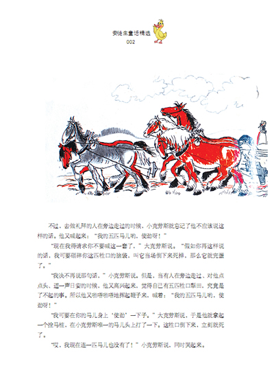 “我决不再说那句话,”小克劳斯说。但是,当有人在旁边走过、对他点点头、道一声日安的时候,他又高兴起来,觉得自己有五匹牲口犁田,究竟是了不起的事。所以他又啪嗒啪嗒地挥起鞭子来,喊着:“我的五匹马儿哟,使劲呀!”