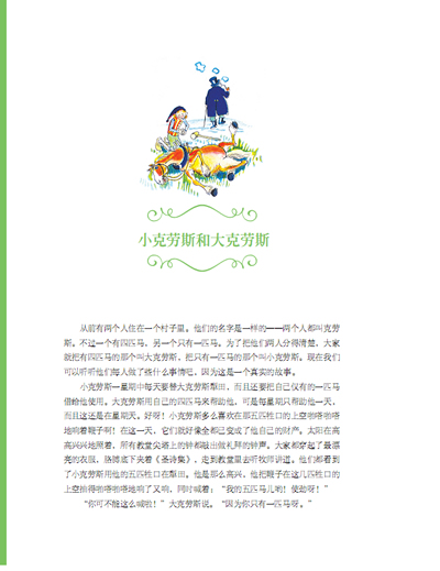 从前有两个人住在一个村子里。他们的名字是一样的——两个人都叫克劳斯。不过一个有四匹马,另一个只有一匹马。为了把他们两人分得清楚,大家就把有四匹马的那个叫大克劳斯,把只有一匹马的那个叫小克劳斯。现在我们可以听听他们每人做了些什么事情吧,因为这是一个真实的故事。