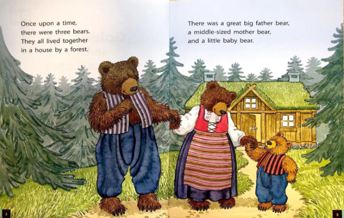 从前,有一个女孩叫金发姑娘。一天,她在森林里散步,不一会儿就来到一栋房子前。她敲了敲门,没人应答,就直接走了进去......
