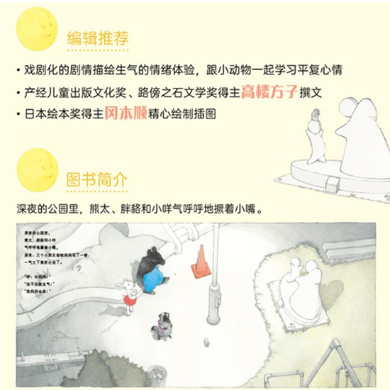 “本书为儿童绘本/图画故事”“离家出走”终将因爱而归,有时候,适当地发泄情绪也没什么不好。戏剧化的剧情描绘生气的情绪体验,跟小动物一起学习平复心情。产经儿童出版文化奖、路傍之石文学奖得主高楼方子撰文,日本绘本奖得主冈本顺精心绘制插图。深夜的公园里,熊太、胖貉和小咩气呼呼地撅着小嘴。原来,三个小朋友都被妈妈骂了一顿,一气之下离家出走了。他们在公园里晃来晃去、在街道上恶作剧,最终来到了原野。原野的小房子里,传来了悦耳的歌谣,三个小朋友也开始想家了……