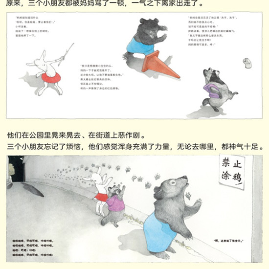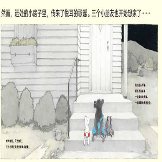 这本绘本颜色运用得不多,简单的灰白黑背景中,三个小动物格外突出。细致的画与真实的语言巧妙结合,三个小动物就像三个小朋友一样活灵活现。在这样的色调与语言中,孩子的情绪很容易随着书的节奏上下起伏。不开心、委屈、生气、孤单、疲惫……各种各样的心情,都被温柔的月亮婆婆收入眼底。三个小动物*终向家走去,小读者的心也归于沉静。