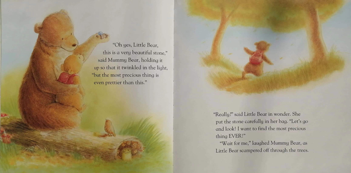 Little Bear is looking for the most precious thing in the world. She finds a beautiful blue stone, a soft rose, a fluffy feather and a dancing butterfly, but Mummy Bear says she can think of something even more precious. What could it be?