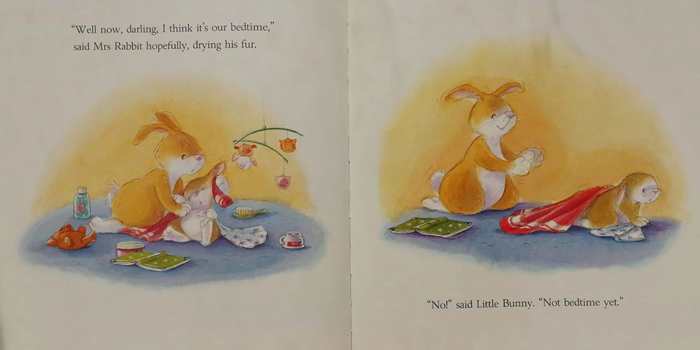 "Aaah,peace and quiet at last,"sighs Mrs Rabbit,tucking her children into bed.But it doesn't last for long! Her baby is still a bubbly,hoppity,run-around-the-house bunny. Mrs Rabbit must try all the tricks she knows to coax him to sleep. Will anything work?