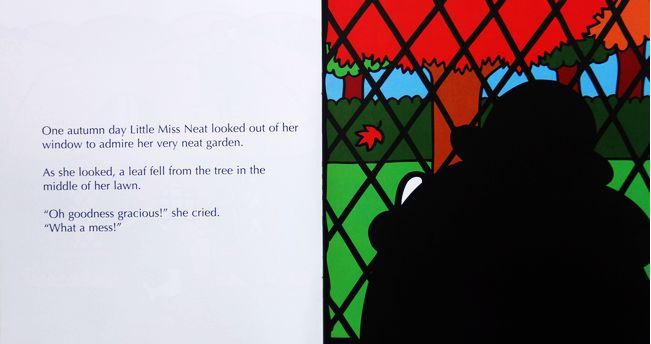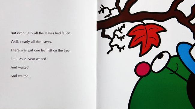 Little Miss Neat非常爱干净,她住的地方总是一尘不染,而秋天是她最讨厌的季节,为什么呢?因为秋天叶子会开始掉落,而Little Miss Neat原本整齐干净的花园就会有碍眼的落叶。每掉一片叶子,Little Miss Neat就会跑到花园去把叶子捡起来,都进垃圾桶里,一整天下来,Little Miss Neat来来回回不下数百次吧,把Little Miss Neat给累死了!某天,Mr. Happy经过,建议Little Miss Neat可以等树叶全部掉光在一次清理会比较快,但是Little Miss Neat实在是受不了脏乱,她在树下等阿等,等阿等,等到最后一片叶子掉落,但当大多数的叶子都掉完了,树上记然还剩一片叶子,Little Miss Neat当下愣住了,不知该如何是好!好险有Mr. Happy的帮忙,他把最后一片叶子直接给摘了,Little Miss Neat太感激Mr. Happy了!到了最后,Mr. Happy还给了Little Miss Neat一个小建议,让她到了明年的秋天时可以不用这么劳累!