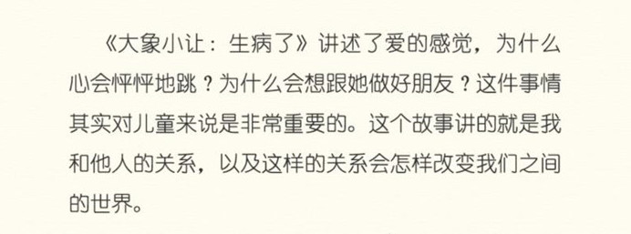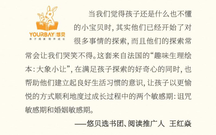 《大象小让》系列(全3册),共分为三册分别为《粑粑》《臭屁》《爱情菌》,适合2-6岁的小朋友阅读,告诉小朋友正确认识自己的情绪和生理现象。三本书分别从2-6岁小朋友最感兴趣的事情说起:大象拉了个小粑粑,大象憋不住臭屁以及藏在大象心中的爱情菌这三个角度,从小动物可爱的表现幽默的说出了小朋友心中的小情绪以及如何正确认识自己的生理现象。