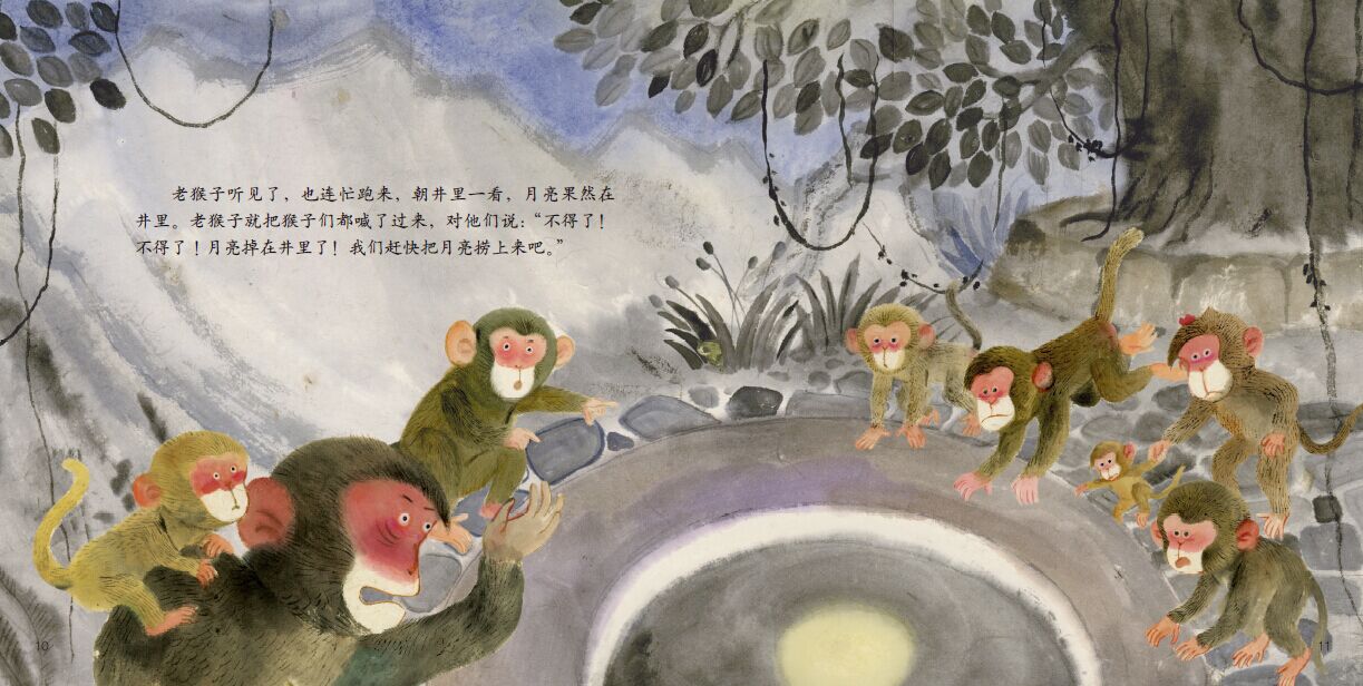 《猴子捞月亮》—— 一个月圆的晚上,猴子们蹦蹦跳跳下山来玩,突然,猴子们惊慌起来——怎么办?!月亮掉进井里了。为了捞起月亮,猴子们挂成一串,一直到井里。可是,月亮一捞就碎,猴子们急得吱吱叫,直到老猴子抬头往天上一看,才恍然大悟。