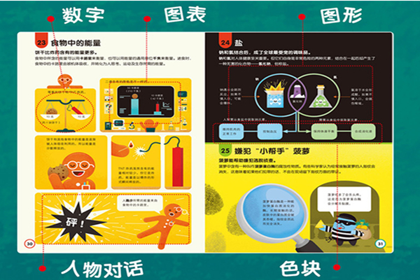 借助图形、图表、数字、色块、人物对话等多种表现形式,多角度呈现知识特点和信息关联,孩子容易理解和记忆。从宏观到微观的解答,清晰呈现每一个知识脉络,展现知识细节,给孩子完整的认知体系。把知识内容和逻辑关系直观地展现出来,也非常符合孩子的认知水平和阅读趣味。