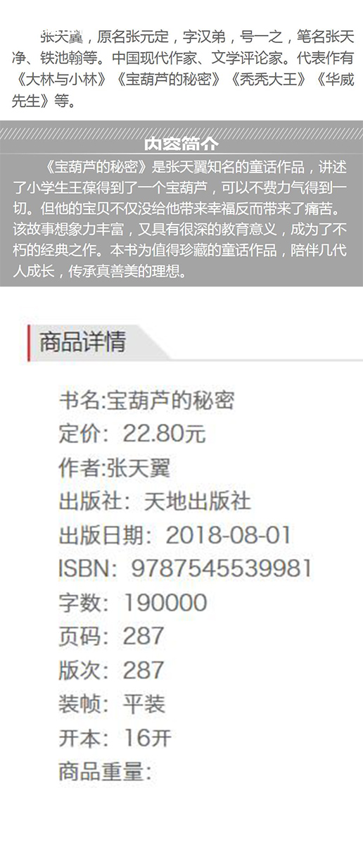 《宝葫芦的秘密》是张天翼知名的童话作品,讲述了小学生王葆得到了一个宝葫芦,可以不费力气得到一切。但他的宝贝不仅没给他带来幸福反而带来了痛苦。该故事想象力丰富,又具有很深的教育意义,成为了不朽的经典之作。本书为值得珍藏的童话作品,陪伴几代人成长,传承真善美的理想。