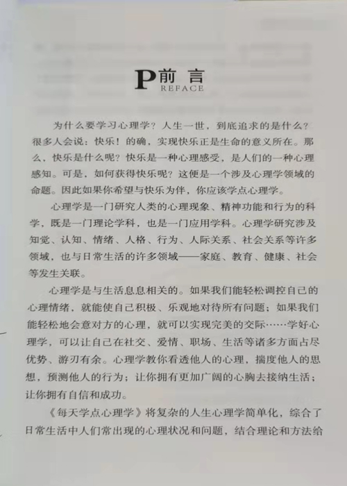 心理学问题在现代人们的生活中涉及广泛,无论是人们生活中的衣食住行,为人处世,还是工作中的人际关系,心理学的影子无处不在。心理学是一门研究人类及动物的心理现象、精神功能和行为的科学,它既是一门理论学科,也是一门应用学科,包含理论心理学与应用心理学两大领域。本书涉及心理学的许多方面,每天学点心理学,让你学会了解自我,学会调节的心理、控制自己的情绪,让你在心理学的熏陶下不断进步,寻找到人生最本真的意义。