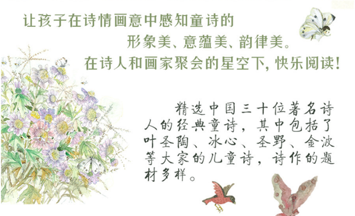 这本童诗集虽然只选了二十首诗,但时间的跨度很长,从新诗发轫时期到近三十年的新时期,都选了有代表性的诗人诗作,其中包括了叶圣陶、冰心、圣野、金波等大家的儿童诗,诗作的题材多样。诗情画意也是这本绘本的特点。