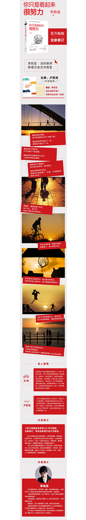 《你只是看起来很努力》百万畅销书,全新修订,李尚龙新增万余文字。 全书50余篇作者亲历亲闻故事,以犀利的视角,独到另类的思考方式,为你揭开成长成功之路上的面纱,让你看清现实,认清自己。让每一个面对学业压力、青春迷茫、爱情困惑的年轻人,都能够无惧无畏,成就更好的自己。 书中《你只是看起来很努力》《优秀不够,你是否无可替代》《你以为你在合群,其实你在浪费青春》等文章,曾引爆微信朋友圈,被各大门户网站、新浪微博、知乎、豆瓣、人人网等疯狂转载,总阅读量逾亿。