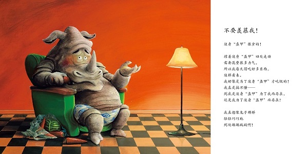 这是一本给孩子的励志绘本。作为一个普普通通的小孩,我很羡慕犀牛,一身厚厚的皮,像盔甲一样。没想到犀牛却羡慕着兔子,兔子又羡慕着鲸鱼……每个人都有优势和不足,我们总是想要自己没有的东西,其实就算拥有了那些东西,烦恼也不少,那么,不如好好珍惜自己现在拥有的吧!