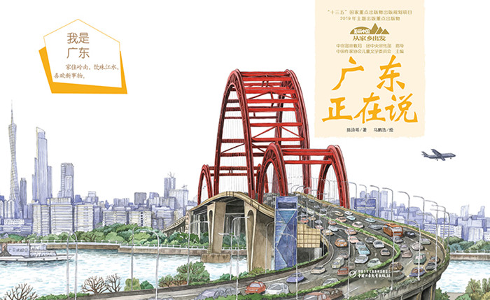 爱祖国,从爱家乡开始。 “美丽中国·从家乡出发” 系列图画书由中宣部宣教局和团中央宣传部指导,中国作家协会儿童文学委员会主编,入选“十三五”国家重点出版物出版规划项目、2019年主题出版重点出版物。本系列图画书由35位著名作家,如韩毓海、高洪波、金波、曹文轩、白冰、秦文君、汤素兰等,40余位画家如刘为民、李明伟、黄木华、黄妍、张晓明、刘振君、钟彧等,共同创作,共35册,内容包括中国总说和34个省级行政区的地理、景观和人文,每个地方一册。既有中华五千年的灿烂历史和文化脉络梳理,又有新时代新面貌。 主要面向5~12岁的少年儿童,旨在通过抓取最能体现家乡美的元素,反映家乡之特色、国家之壮美,从而激发广大少年儿童对家乡、对祖国的热爱,增强他们的民族自豪感和自信心,帮助他们打好精神底色。 《广东正在说》是“美丽中国·从家乡出发”系列图画书中的一册,通过一句句设问将广东的地理特征、特色美食,以及名人、名山、名寺、名园等铺陈展开,以小主人公和一只猫为线索,向小读者娓娓道来。此外,有关广东的经典建筑以及民风民俗的描述和描绘,则将读者们深深吸引,仿佛同时置身于广东的古老与现代之中。语言简练而不失亲切,画面明快、有趣,快来一起玩“找猫”游戏吧。