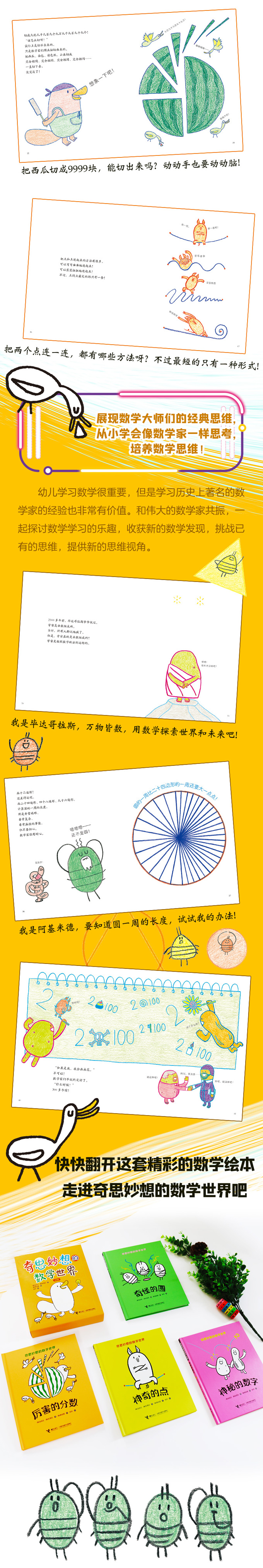 《奇思妙想的数学世界》系列是一套适合低龄儿童的数学启蒙绘本,共有4册,包括《神奇的点》《神秘的数字》《奇怪的圆》《厉害的分数》,涉及的数学概念有点、数字、圆和分数等。书中通过可爱的小主角之间的互动——天马行空的思维想象和环环相扣的逻辑性追问,让孩子们了解到“数学是什么”“数学的奇思妙想是怎么来的”“数学有什么用处”,以及点、圆、数量等数学领域的抽象概念…… 圆的里面藏着一个怪物,会是什么呢?可爱的小蚯蚓和西瓜虫们对圆充满好奇,他们一起画画圆,量量圆的大小,是否能找出怪物?快跟随伟大的数学家阿基米德,探索奇奇怪怪的圆,体验数学世界的无穷奥妙。书中展示出计算圆一周长度的经典办法,让孩子们领略到数学家思想的美妙。