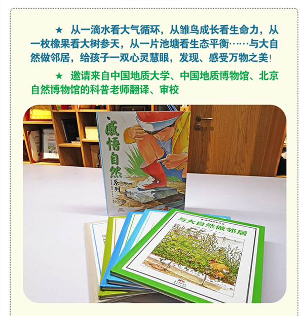 《感悟自然系列》是一套适合4~12岁孩子阅读的科普绘本,包括《与大自然做邻居》《白头海雕》《池塘》《一滴水》《橡树》。这套书的作者、画者是同一人,名叫高登·莫里森。这套科普绘本第一本于1998年出版,其后4本基本上以每两年一本的速度推出,可谓精打细做。既有故事脉络,又有知识点穿插其中,主副两条线并行。