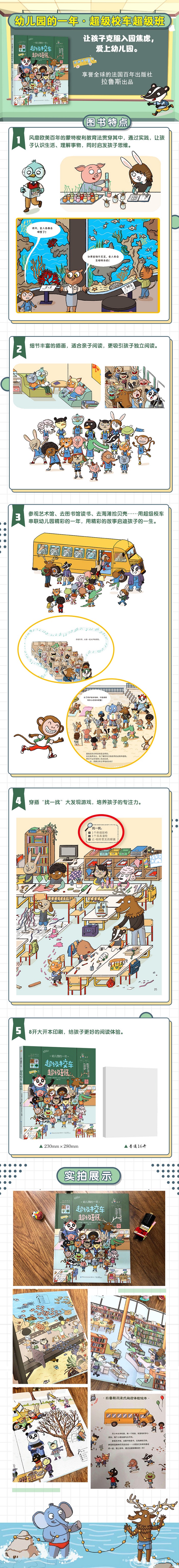 ·风靡欧美百年的蒙特梭利教育法贯穿其中,通过实践,让孩子认识生活、理解事物,同时启发孩子思维。 ·细节丰富的插画,适合亲子阅读,更吸引孩子独立阅读。 ·参观艺术馆、去图书馆读书、去海滩捡贝壳……用超级校车串联幼儿园精彩的一年,用精彩的故事启迪孩子的一生。 ·穿插“找一找”大发现游戏,培养孩子的专注力。 ·8开大开本印刷,给孩子更好的阅读体验。