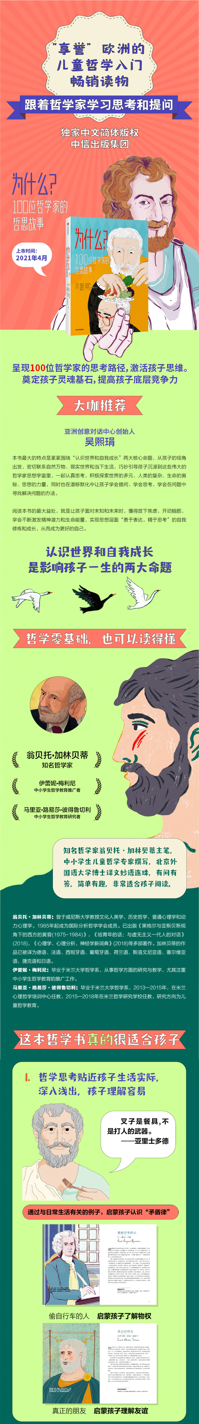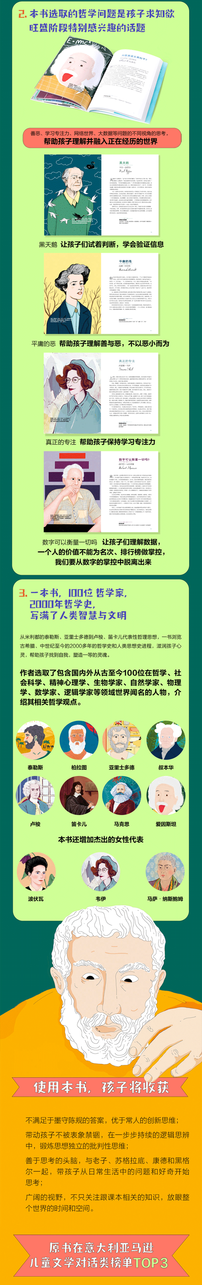 《为什么?100位哲学家的哲思故事》是一本写给孩子的哲学启蒙书。本书旨在教会孩子们学会思考世界和认识自我。 本书精选了全球100位哲学家,从西方历史上哲学家泰勒斯开始,到当代的哲学家,时间跨度两千多年。 作者用深入浅出的语言,凝练地介绍了100位哲学家核心哲学思想,并通过有趣的故事、贴近孩子生活的事例,启发孩子们以哲学的视角探寻现象背后的原因,用开放的心态不断探索和认识世界,帮助孩子拓展认知边界,寻找更远的地平线和更多的可能性,建立更健全的人生观和价值观。 本书不是一本写满答案的书,但翻过这本书的每一页,孩子们都会获得一个看问题的新视角,借以反观自己的想法,培养批判思维、解决问题的能力,并学会独立思考。